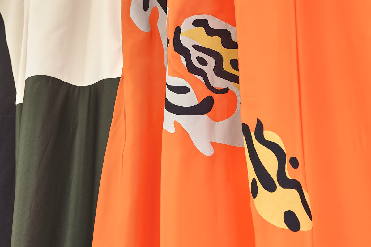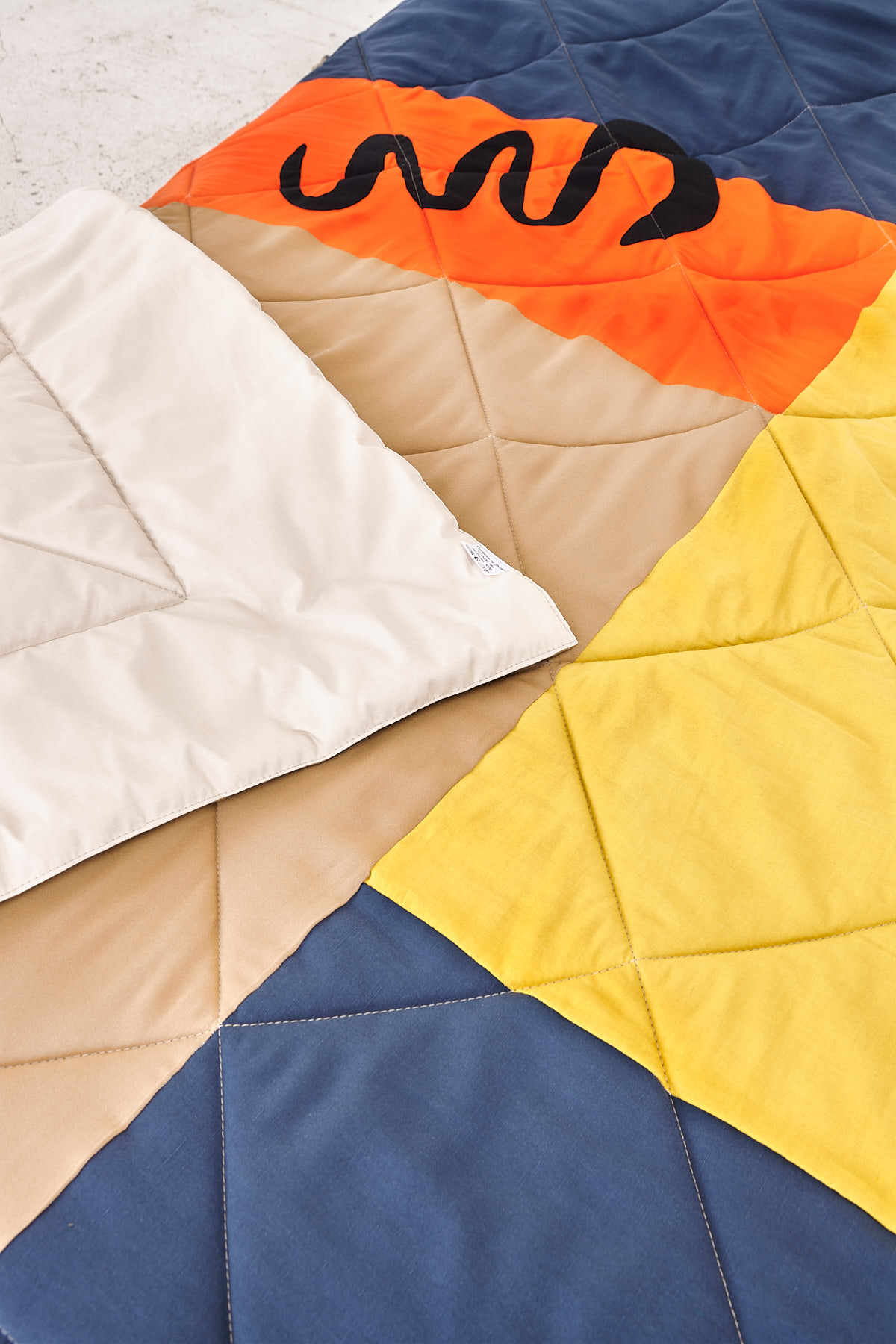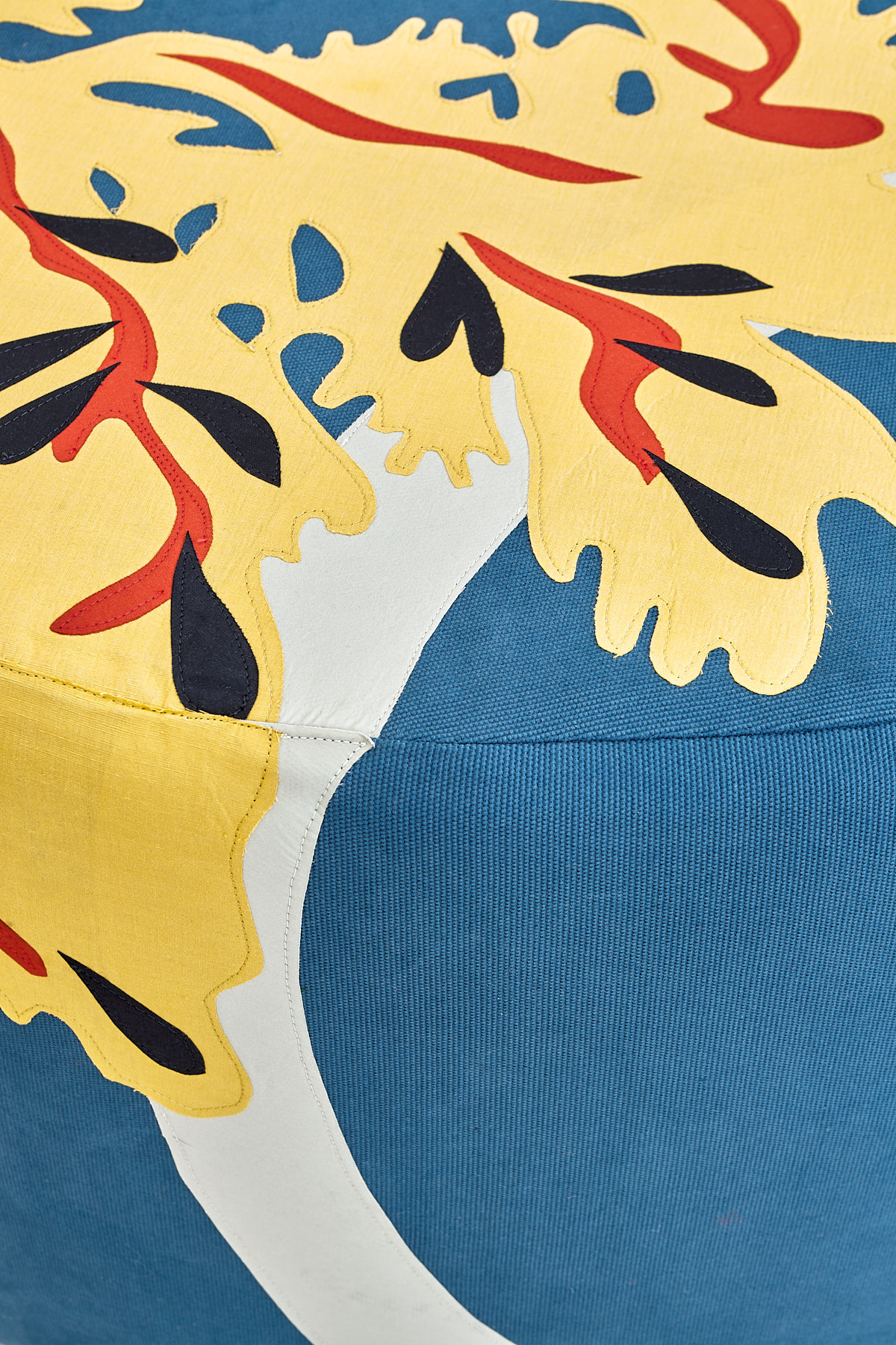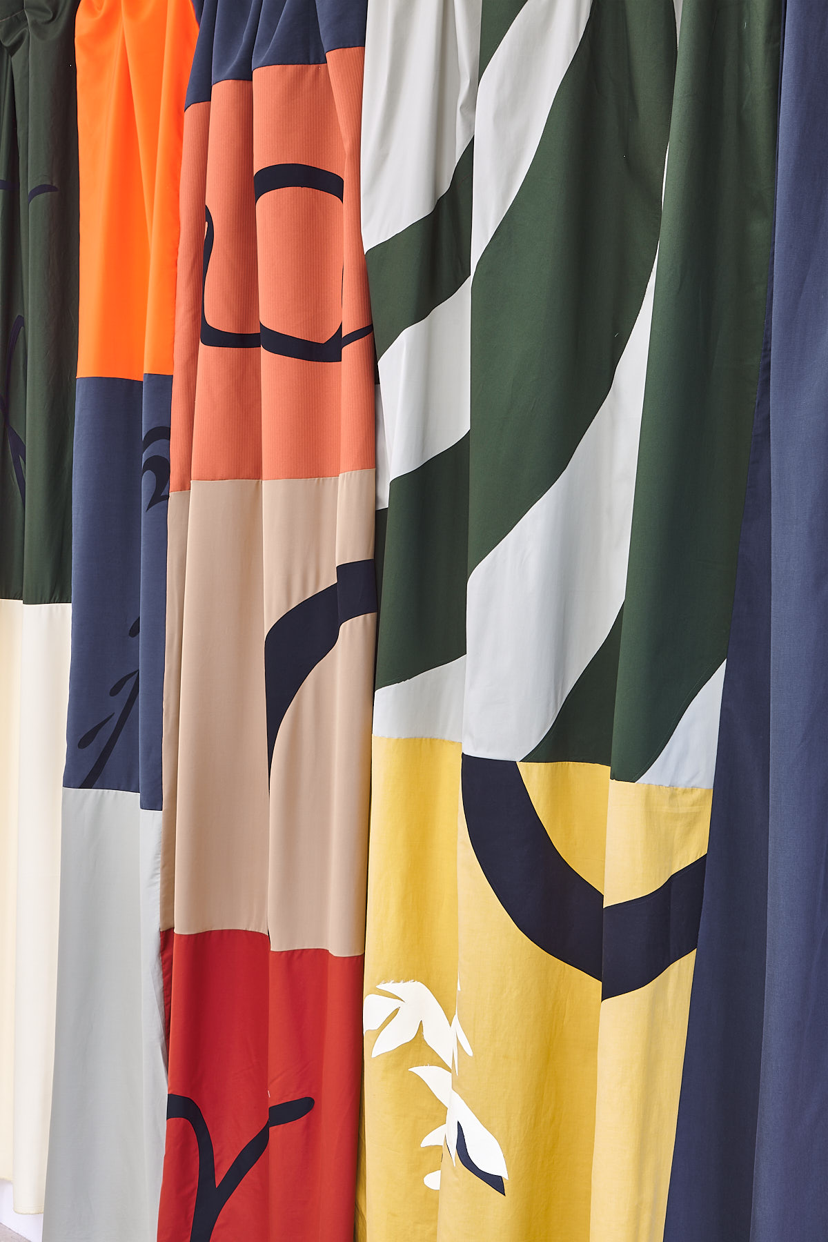 Création d’une panoplie entière pour la chambre d’une villa privée. Le rideau, le couvre-lit et le pouf photographiés aux côtés des objets d’anti_matiere_interieur.