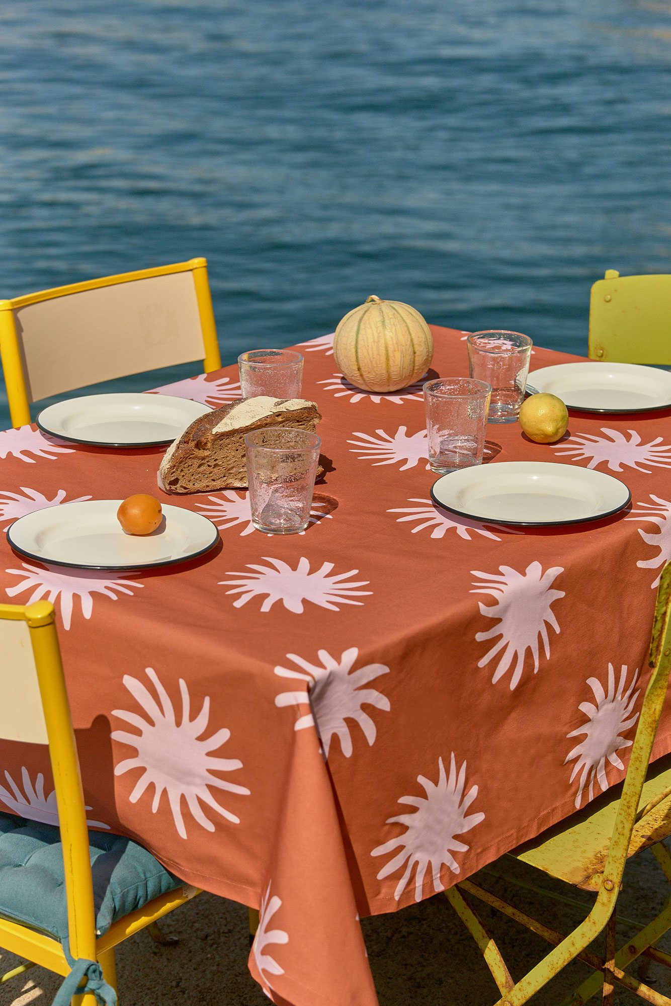 Nappe, modèle Soleil nappe en coton imprimée en France 146 cm x 250 cm lavage et repassage en cycle délicat (30°)