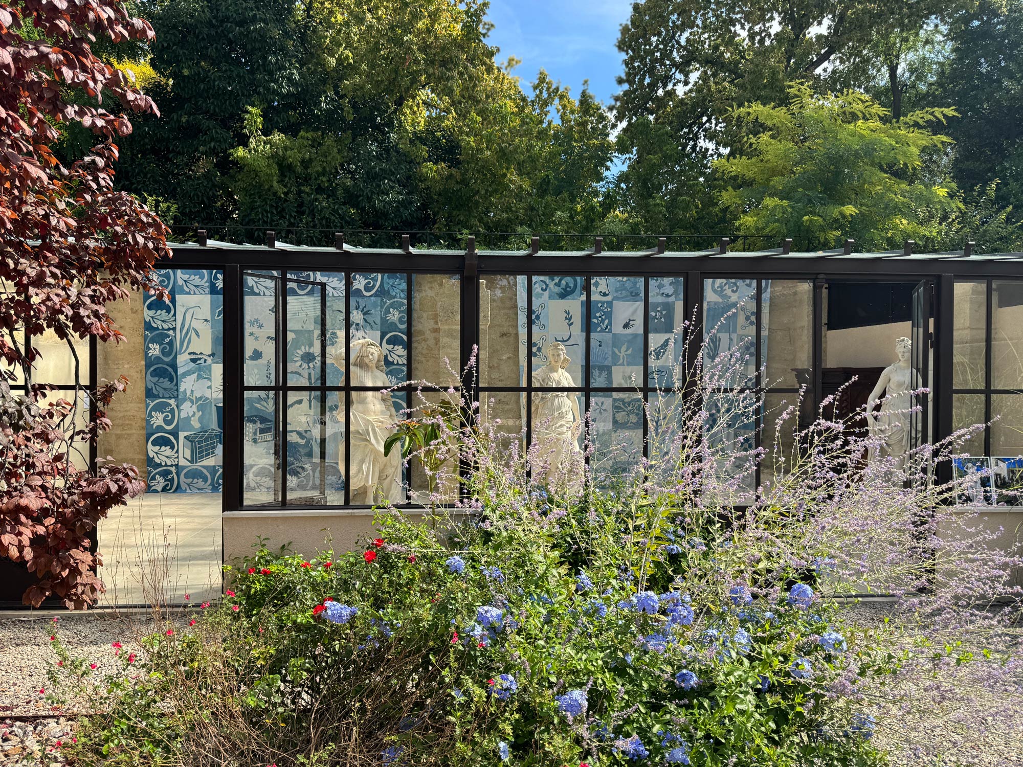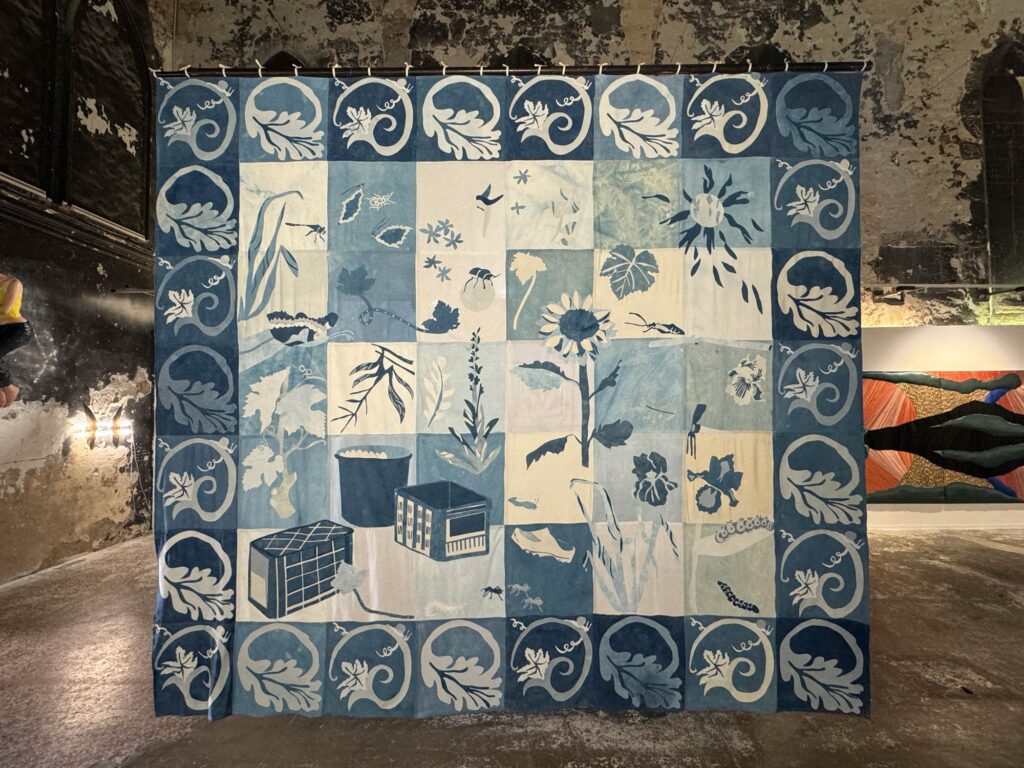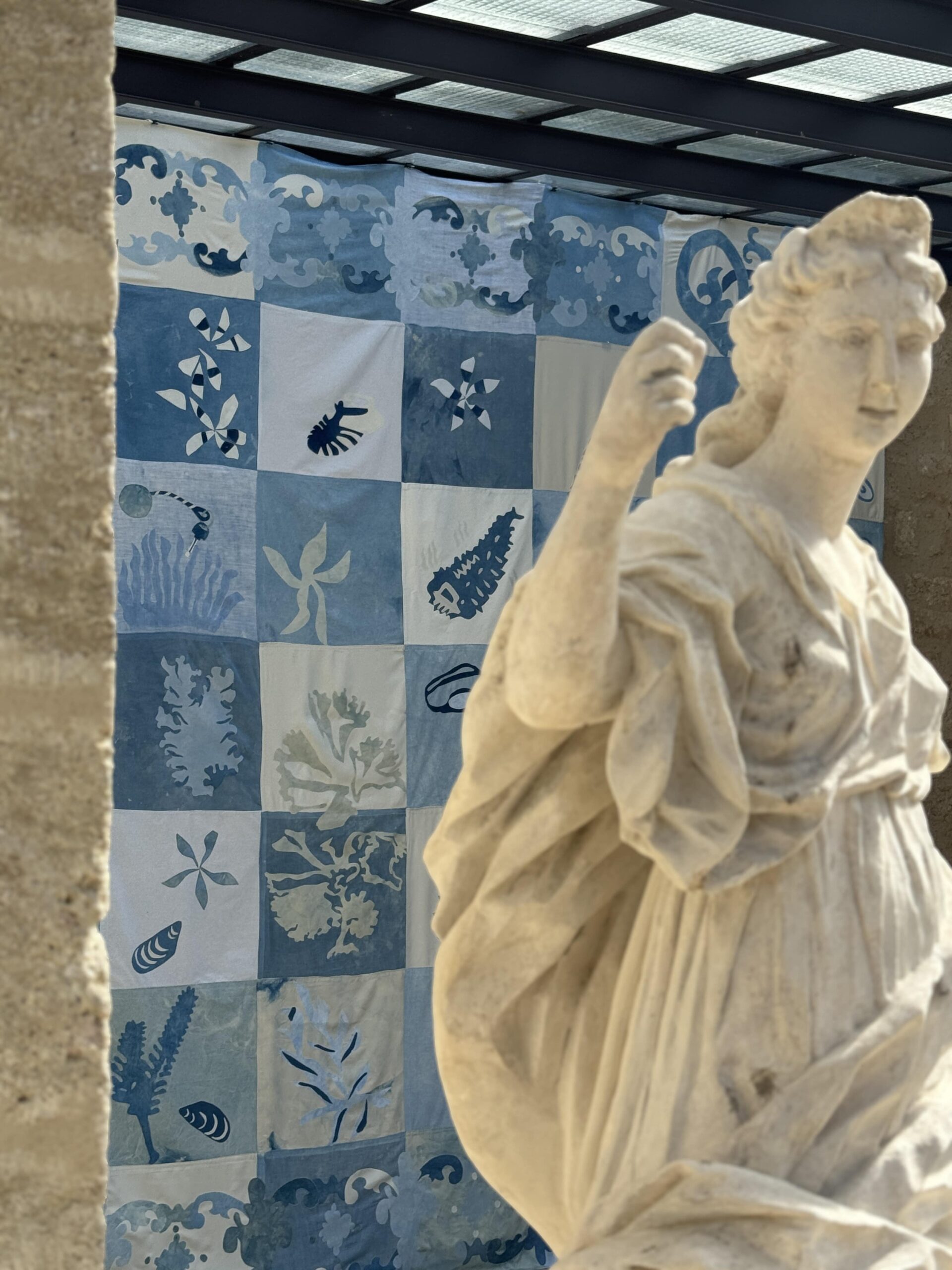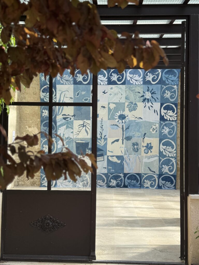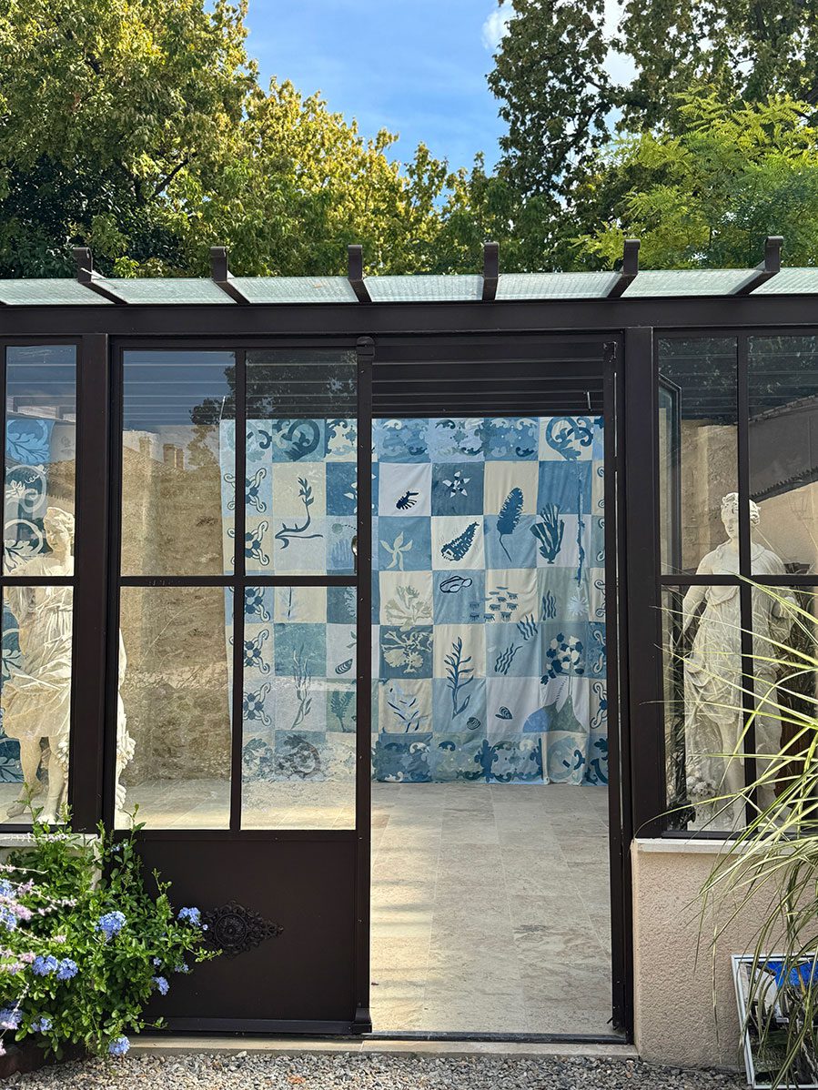 2024 sète, lisbonneDans le cadre de la biennale d’art contemporain Sète-Lisbonne SLA, deux tentures monumentales sont présentées. Chaque tenture de 5 mètres par 6 mètres a été réalisée à la main à partir de textiles teints à l’indigo un par un. Ces oeuvres textiles font référence aux azulejos décoratifs portugais, comme un hommage aux décors architecturaux mettant ici en valeur les mondes invisibles de la Terre et de la Mer. Les pièces sont réalisés à partir de morceaux de coton, de lin et de soie afin d’obtenir un camaïeu de bleus pluriels.