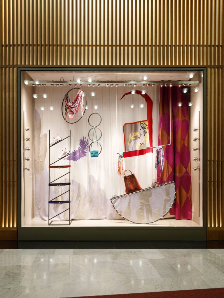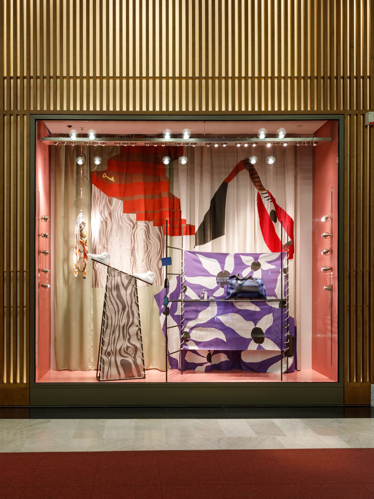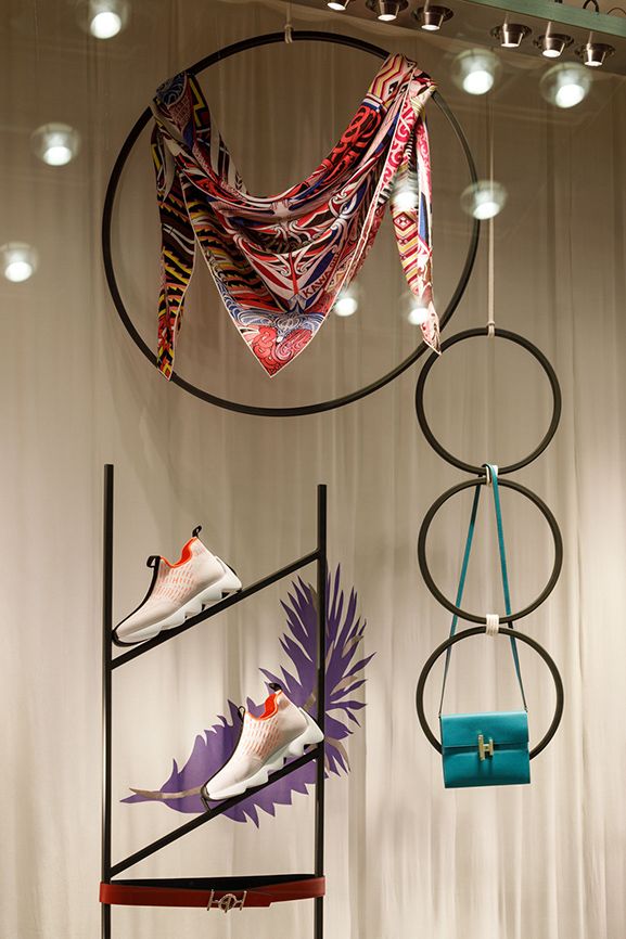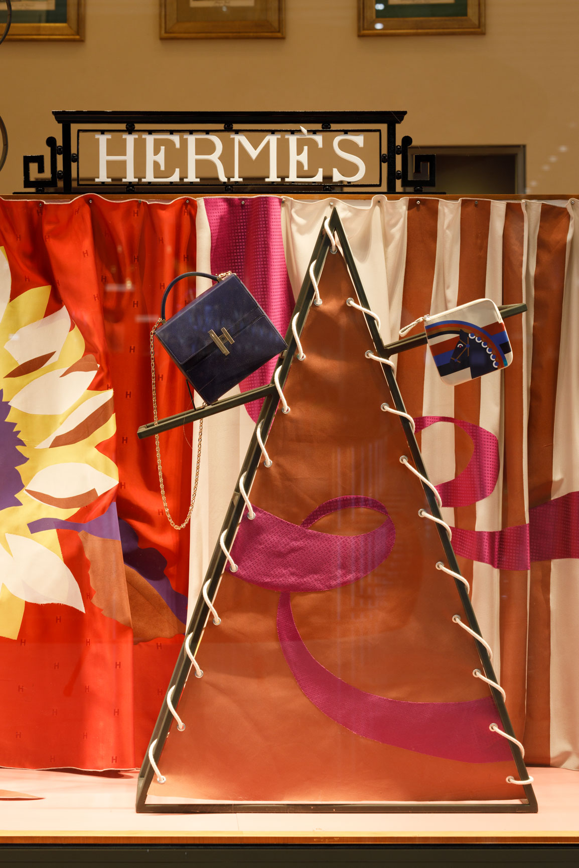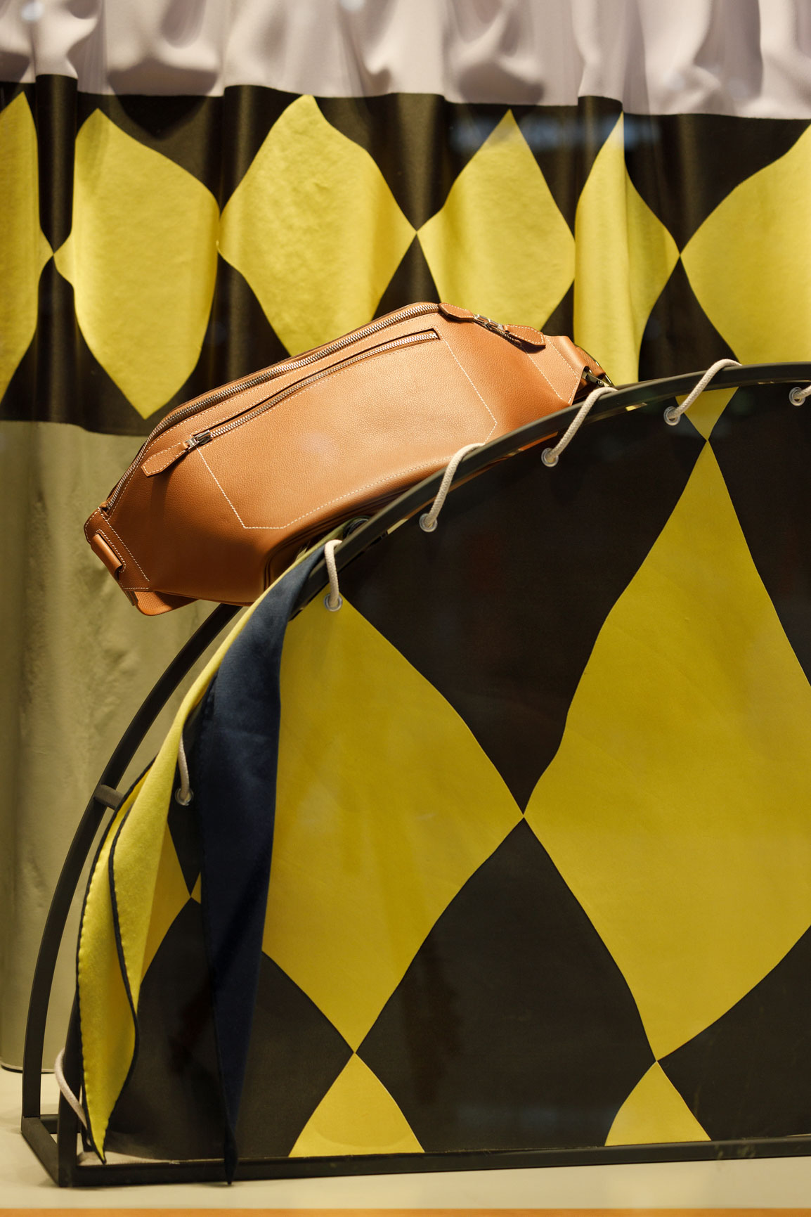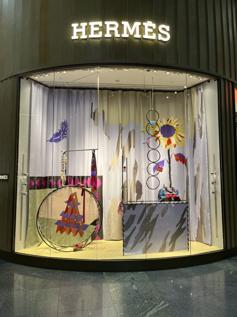 Pour les vitrines Hermès des aéroports de Paris Charles de Gaulle et Istanbul , les Crafties proposent leur “cirque surréaliste” composé de tambours en textiles et métal présentant les produits de la Maison. Cette scénographie a été réalisée à la main dans leur atelier avec l’étroite collaboration du duo de ferroniers Noir Métal et avec les ressources précieuses de la cave à matière Hermès, petit h.
