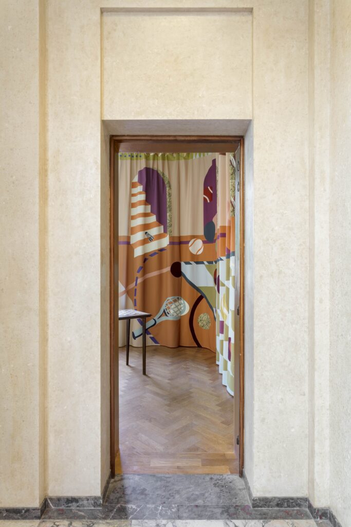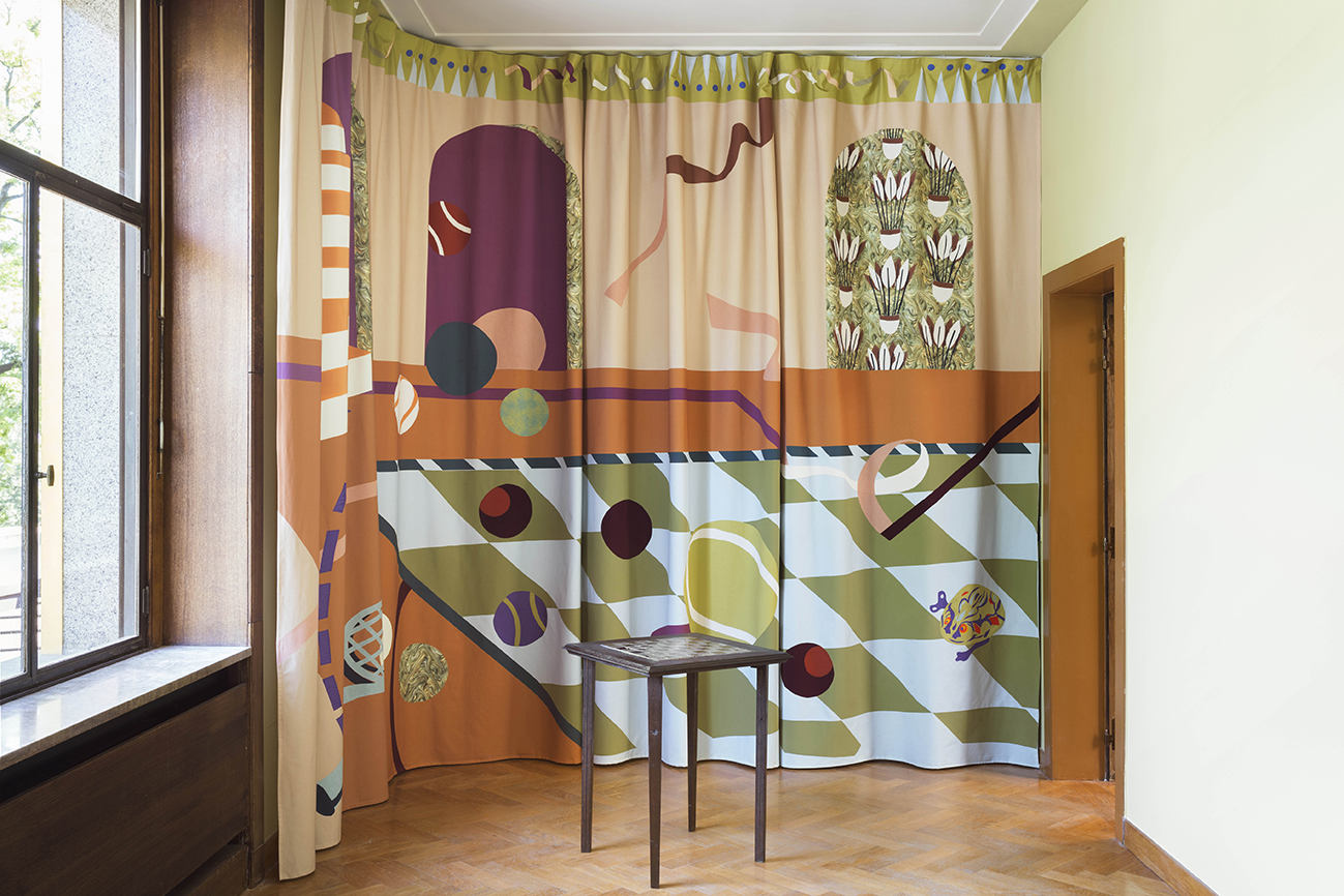 2023 bruxellesLa commissaire d’exposition Anne-Laure Lestage imagine « House of Dreamers », une déambulation poétique dans les espaces de la Villa Empain, demeure Art déco Bruxelloise dirigée aujourd’hui par la fondation Boghossian. Au fil des chambres et salons, les œuvres rassemblées explorent autant les qualités architecturales des espaces que leurs usages. Ce parcours pose la question de la relation des artistes à l’espace domestique, en convoquant la notion de décoratif dans les arts moderne et contemporain. Les Crafties créent à l’occasion un rideau panoramique illustré d’une partie sans règles, d’un terrain surréaliste entre jeux de balles et de raquettes.