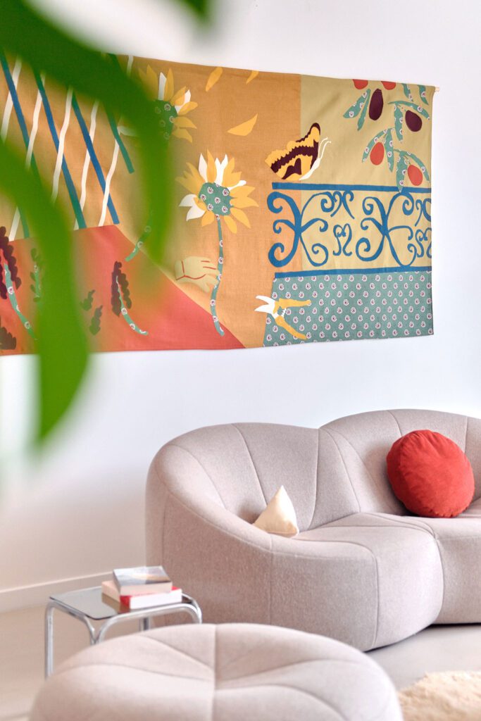 Dans un très bel écrin du 13ème arrondissement, une tenture sur-mesure fait face à une cheminée signée Frédéric Sichel-Dulong de 1987, élève de l’artiste sétoise Valentine Schlegel. Un clin d’oeil solaire pour cette pièce faite à Sète à la main en lin, coton et soie upcyclés.